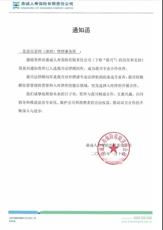 京師深圳律所入選鼎誠人壽保險(xiǎn)有限責(zé)任公司法律顧問庫...