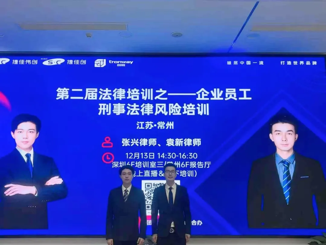 受上市公司捷佳創(chuàng)集團邀請,京師深圳律所張興律師、袁新律師赴江蘇省常州市為捷佳創(chuàng)集團開展了“企業(yè)員工刑事法律風(fēng)險培訓(xùn)”,提高企業(yè)員工刑事風(fēng)險防控意識,助力企業(yè)高質(zhì)量發(fā)展。...