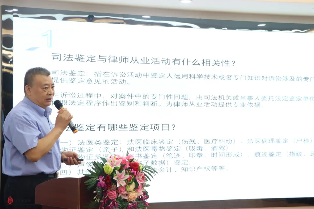 法醫(yī)鑒定人、副主任法醫(yī)師、副所長王志遠(yuǎn)首先對司法鑒定項目進(jìn)行介紹,通過解讀法醫(yī)臨床鑒定、痕跡鑒定、文書鑒定、聲像資料鑒定等內(nèi)容,向與會人員詳細(xì)闡釋了司法鑒定在訴訟活動中的重要性。隨后他通過司法鑒定流程圖的展示,讓與會人員更加清晰直觀地了解司法鑒定的流程。王志遠(yuǎn)副所長表示,司法鑒定可以為刑事偵查提供線索、指明方向,為民事調(diào)解提供技術(shù)支持,在律師辦理案件的過程中,具有不可或缺的作用。