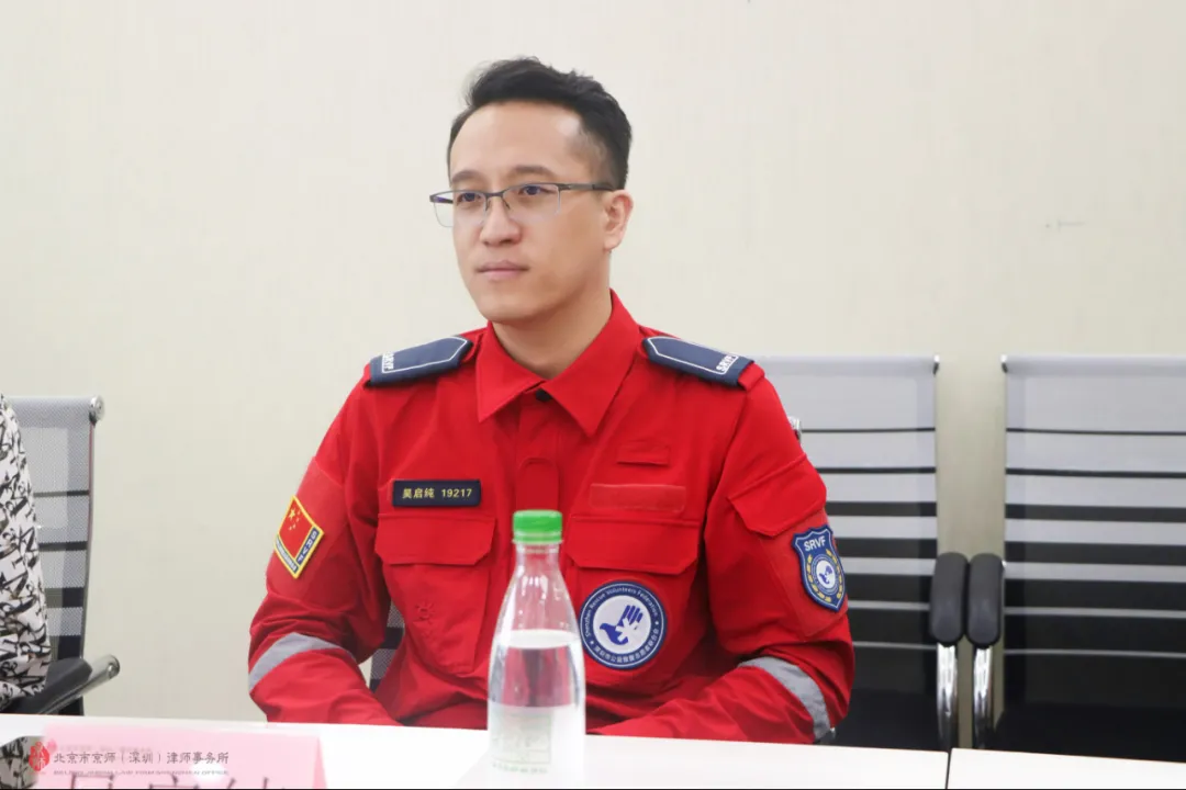 座談會(huì)上,黃志文副部長對救援隊(duì)的組織來源、架構(gòu)、發(fā)展方向進(jìn)行了簡要介紹,并對京師深圳分所給予的活動(dòng)支持表示感謝。黃志文副部長表示,救援隊(duì)在實(shí)際工作以及運(yùn)行過程中,涉及到的許多問題需要有法律方面的專業(yè)知識(shí)護(hù)航,且隊(duì)員在實(shí)施救援時(shí),也需要法律服務(wù)作為強(qiáng)有力的支撐。