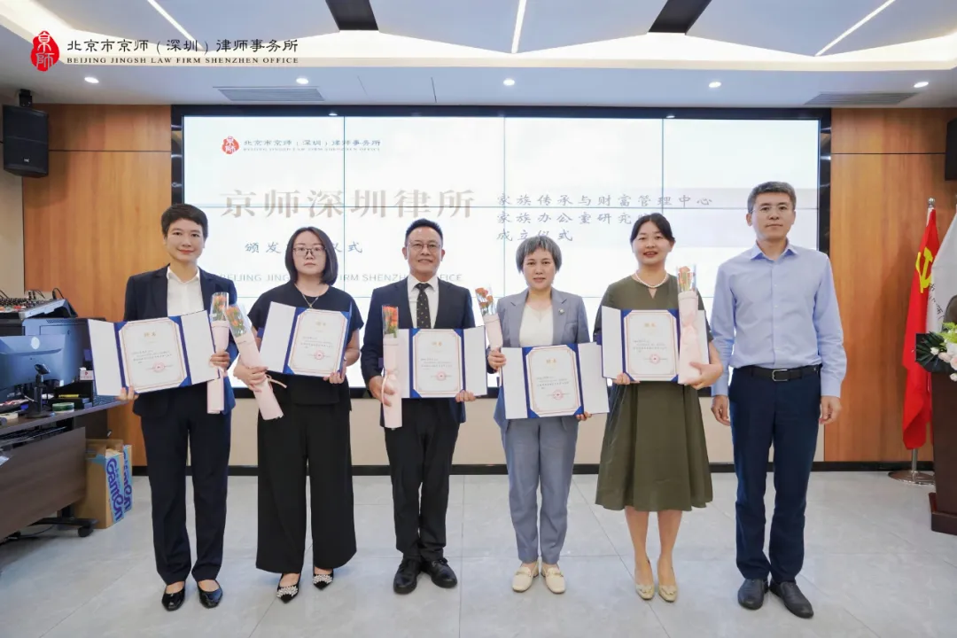 京師深圳律所聯(lián)合創(chuàng)始人、執(zhí)行主任陳修為家族傳承與財富管理中心劉運(yùn)嬌主任、康雪崧主任、李志忠主任、張楓主任,李華一秘書長頒發(fā)聘書。