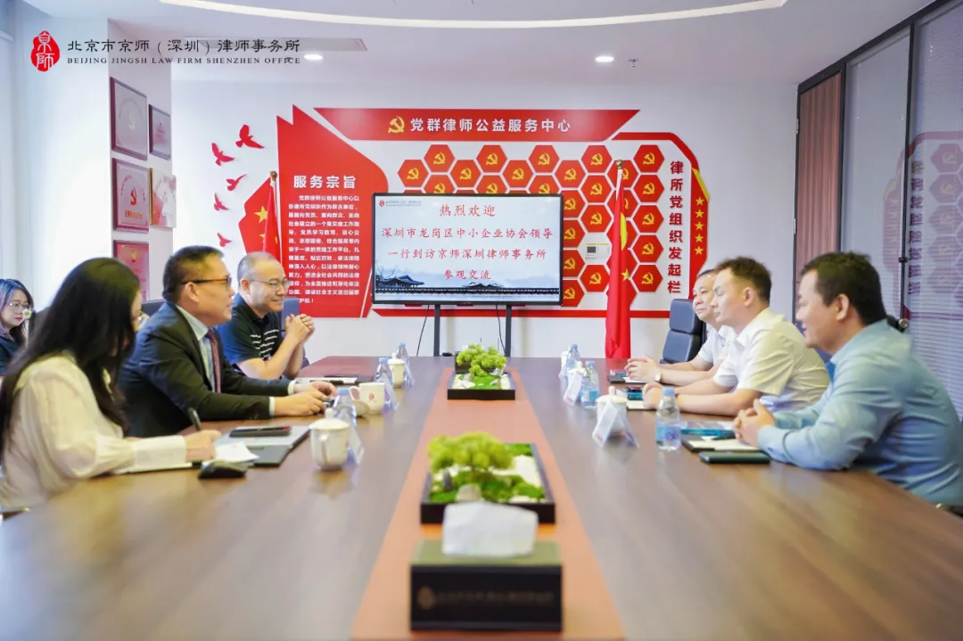 2025年8月27日上午,深圳市龍崗區(qū)中小企業(yè)協(xié)會(huì)輪值會(huì)長(zhǎng)、常務(wù)副會(huì)長(zhǎng)黨長(zhǎng)虹、常務(wù)副會(huì)長(zhǎng)宋利軍、常務(wù)副會(huì)長(zhǎng)柳進(jìn)軍到訪京師深圳律所參觀交流。京師深圳律所聯(lián)合創(chuàng)始人、決策委輪值主任賀樹(shù)奎,京師深圳律所聯(lián)合創(chuàng)始人、管委會(huì)主任陳玉清,京師深圳律所戰(zhàn)略運(yùn)營(yíng)部總監(jiān)張玲代表律所對(duì)協(xié)會(huì)一行的到訪表示熱烈歡迎。