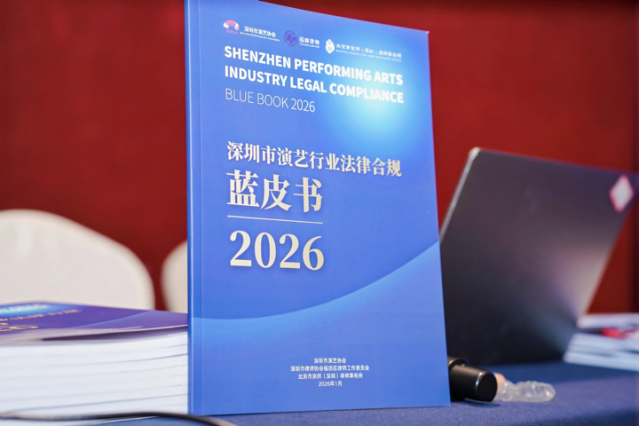 ▲深圳市福田區(qū)司法局相關(guān)領(lǐng)導(dǎo),深圳市福田區(qū)文化廣電旅游體育局相關(guān)領(lǐng)導(dǎo),深圳市演藝協(xié)會(huì)會(huì)長(zhǎng)吳慶捷、深圳市律師協(xié)會(huì)副會(huì)長(zhǎng)黃遠(yuǎn)兵、國(guó)家稅務(wù)總局深圳市福田區(qū)稅務(wù)局相關(guān)工作人員、藍(lán)皮書(shū)主編、首席撰稿人,京師深圳律所高級(jí)合伙人韓菲、京師深圳律所常務(wù)執(zhí)行副主任王昉、深圳市戲劇家協(xié)會(huì)副主席邸敘然、深圳市網(wǎng)絡(luò)直播協(xié)會(huì)副會(huì)長(zhǎng)謝穗嘉、深圳市文化市場(chǎng)行業(yè)協(xié)會(huì)秘書(shū)長(zhǎng)付自虎共同發(fā)布《深圳市演藝行業(yè)法律合規(guī)藍(lán)皮書(shū)》