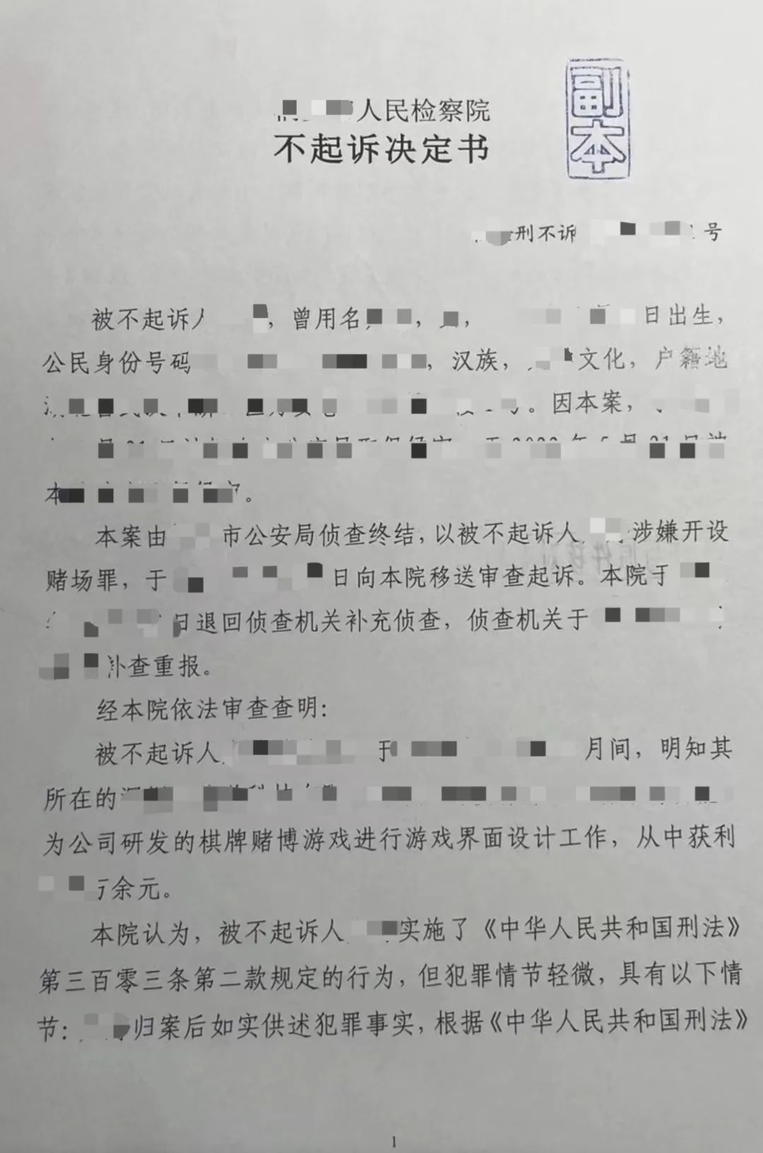 北京市京師(深圳)律師事務所龔國強律師、王丹丹律師、托婭律師團隊收到了來自檢察院的好消息,他們共同辦理的涉嫌開設賭場罪重大刑事案件,成功為當事人爭取到了不起訴的決定書。