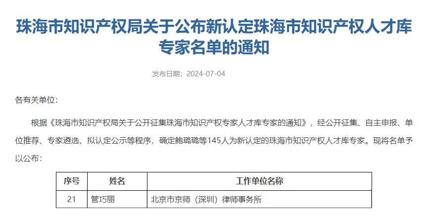 京師深圳律所高級(jí)合伙人、知識(shí)產(chǎn)權(quán)中心主任管巧麗律師深耕知識(shí)產(chǎn)權(quán)領(lǐng)域,積極參與申報(bào),經(jīng)珠海市知識(shí)產(chǎn)權(quán)主管單位的遴選審核環(huán)節(jié),成功入庫(kù),成為珠海市知識(shí)產(chǎn)權(quán)人才庫(kù)專(zhuān)家。