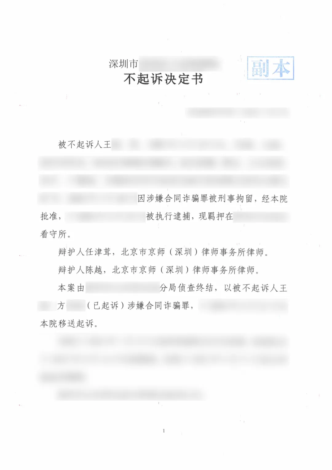 該案是由北京市京師(深圳)律師事務(wù)所任津茸律師、陳越律師代理的合同詐騙案件,在兩位律師的不懈努力下,辦案檢察院最終作出了不起訴決定。