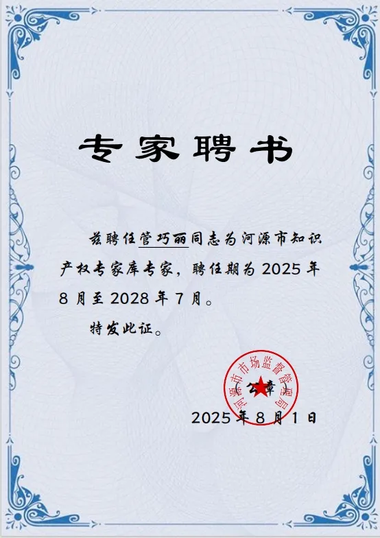 近日,河源市市場監(jiān)督管理局正式發(fā)布河源市知識(shí)產(chǎn)權(quán)專家名單(第四批)的公告,京師深圳律所高級合伙人、知識(shí)產(chǎn)權(quán)中心主任管巧麗律師憑借深厚的專業(yè)積累與行業(yè)影響力獲聘為河源市知識(shí)產(chǎn)權(quán)專家。