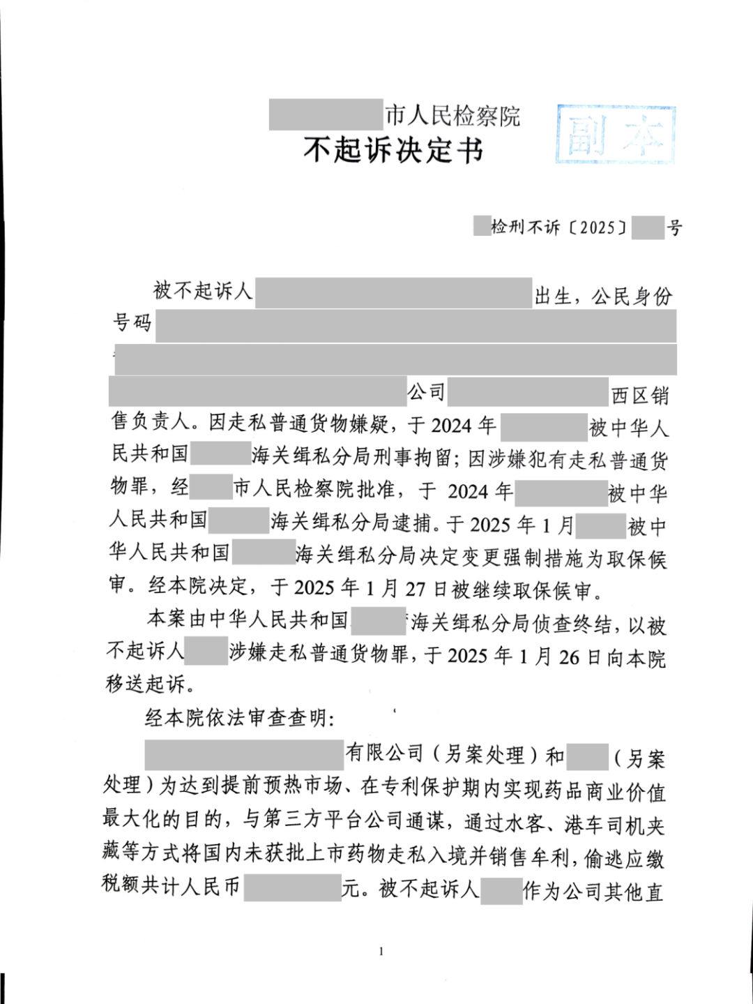 2025年8月13日,京師深圳律所聯(lián)合創(chuàng)始人黃維贊律師收到某市人民檢察院送達(dá)的《不起訴決定書》,決定對(duì)其代理辯護(hù)的涉嫌走私普通貨物罪犯罪嫌疑人Z某不起訴。