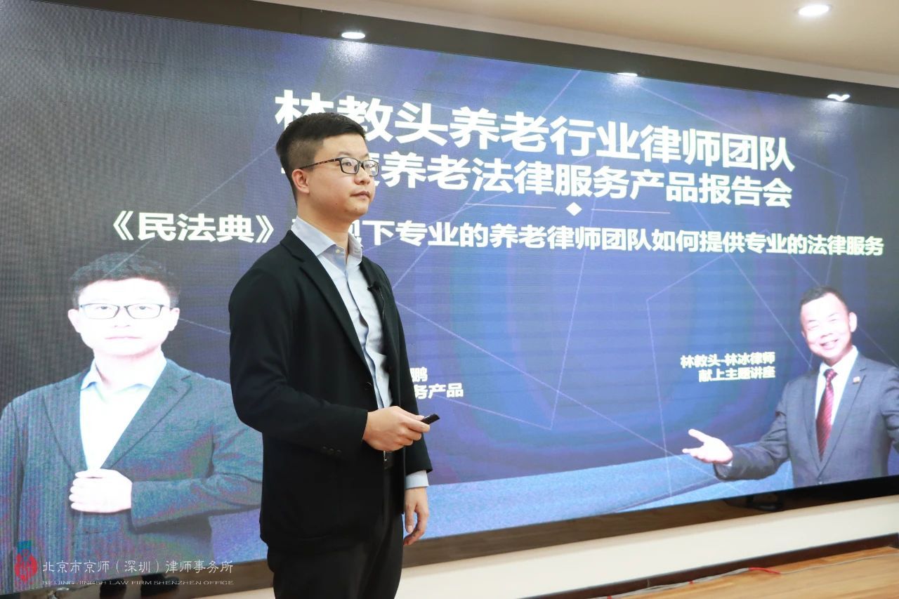 林教頭養(yǎng)老行業(yè)律師團隊導(dǎo)師、京師深圳聯(lián)合創(chuàng)始人林冰律師以“《民法典》新規(guī)下專業(yè)的養(yǎng)老律師團隊如何提供專業(yè)的法律服務(wù)”為主題,分享了作為養(yǎng)老行業(yè)團隊如何打造法律服務(wù)產(chǎn)品以及如何更好的為用戶服務(wù)。