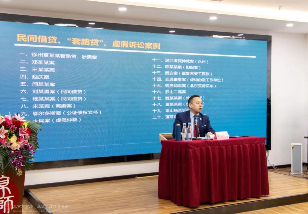 2021年3月27日,民間借貸、套路貸、虛假訴訟專(zhuān)題講座在京師深圳成功舉行。目的在于更好地讓各位律師深入理解民間借貸、套路貸、虛假訴訟的概念與內(nèi)涵,也為防范虛假訴訟提供理論支撐,并提醒律師避免觸及虛假訴訟“雷區(qū)”,合法合規(guī)執(zhí)業(yè)。
