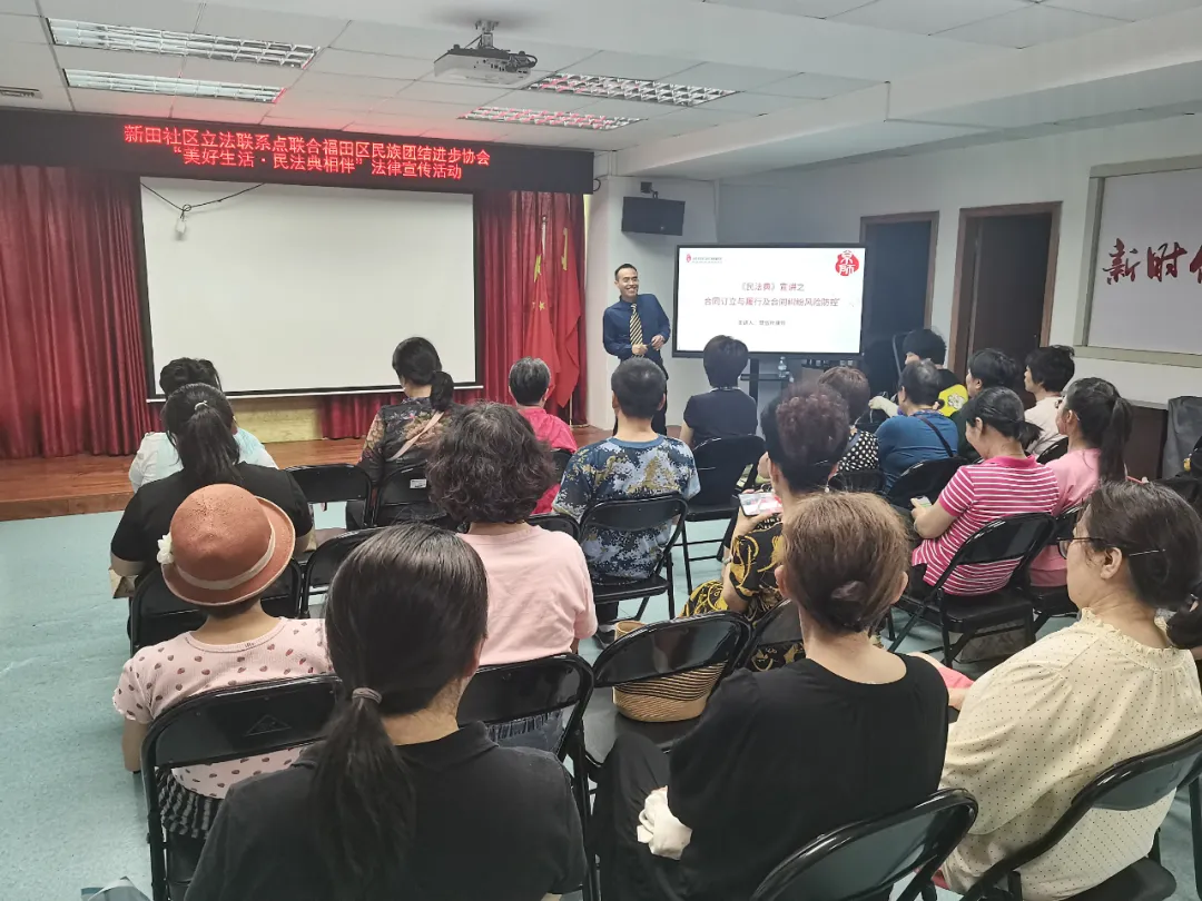 2024年5月17日下午,福田區(qū)華富街道辦新田社區(qū)立法聯(lián)系點(diǎn)聯(lián)合福田區(qū)民族團(tuán)結(jié)進(jìn)步協(xié)會開展“美好生活·民法典相伴”主題宣傳講座,北京市京師(深圳)律師事務(wù)所高級合伙人、民商合同法律事務(wù)部主任甘伍葉律師應(yīng)邀授課。