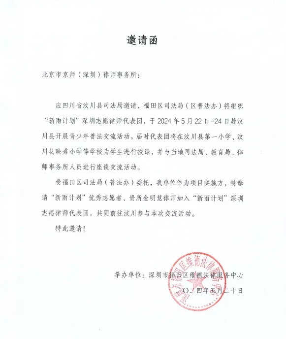 2024年5月22-24日,應(yīng)汶川縣司法局邀請,福田區(qū)司法局(區(qū)普法辦)組織“新雨計(jì)劃”深圳志愿律師代表團(tuán),于2024年5月22日至24日赴汶川開展青少年普法交流活動(dòng)。本次活動(dòng)由福田區(qū)司法局二級調(diào)研員羅展、工作人員黃新維帶隊(duì),由項(xiàng)目實(shí)施方維德中心主任李嚴(yán)及來自多家律所的11名深圳律師組團(tuán)前往交流。