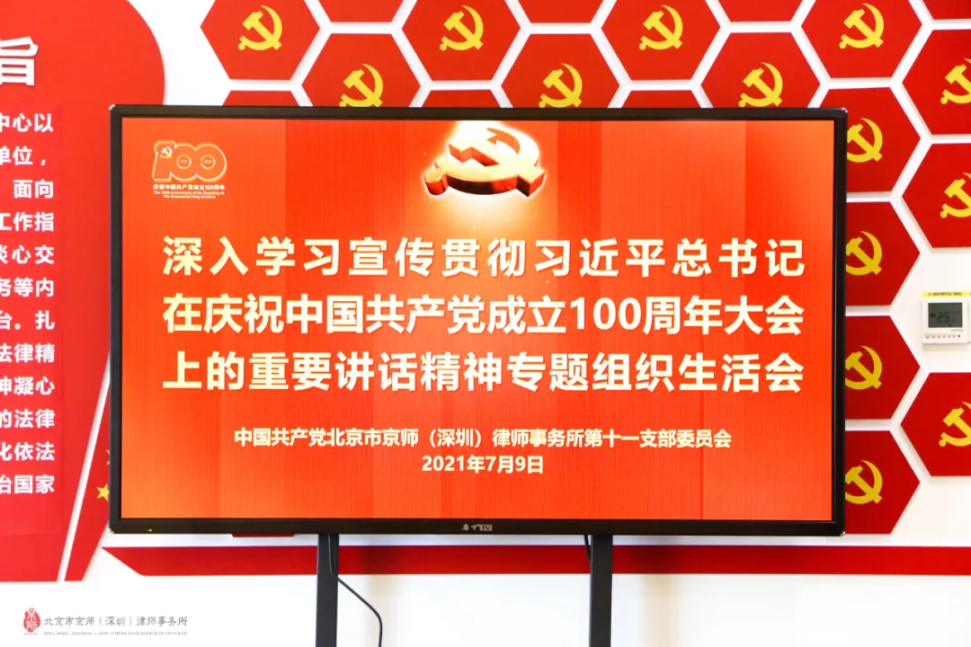 2021年7月9日,京師深圳律所第十一黨支部在9樓黨建室舉行深入學習宣傳貫徹《習近平總書記在慶祝中國共產(chǎn)黨成立100周年大會上的重要講話精神》專題組織生活會。京師深圳律所第十一支部書記、聯(lián)合創(chuàng)始人、主任邵雷雷同志主持本次會議。