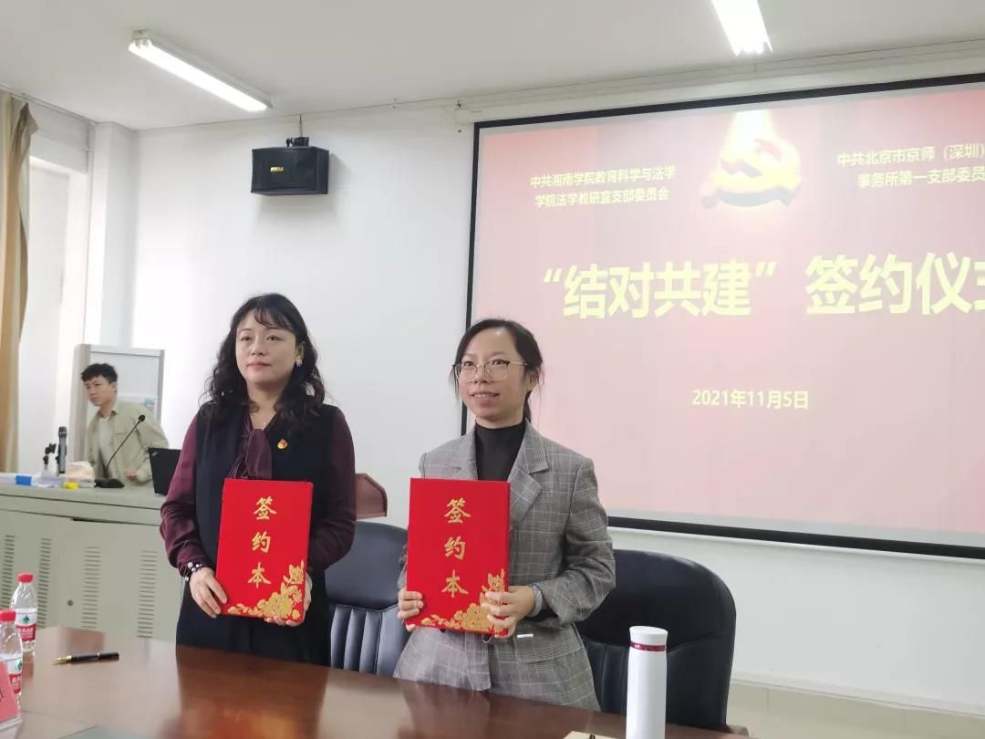 最后,第一黨支部組織委員趙文捷律師代表北京市京師(深圳)律師事務(wù)所第一黨支部與湘南學(xué)院教育科學(xué)與法學(xué)學(xué)院法學(xué)教研室黨支部在會議室簽訂了《結(jié)對共建協(xié)議》。
