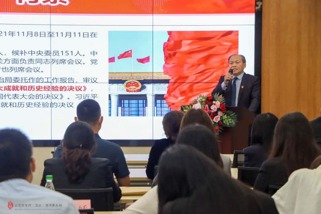 為推進(jìn)北京市(深圳)律師事務(wù)所黨建促進(jìn)所建、專業(yè)化發(fā)展需求,提升律師隊伍的凝聚力、戰(zhàn)斗力、向心力,特邀請深圳市律師行業(yè)黨委江定航副書記為我們講授黨課,帶領(lǐng)我們一起學(xué)習(xí)十九屆六中全會精神,把握精神實質(zhì),學(xué)習(xí)建黨百年的寶貴經(jīng)驗,領(lǐng)會核心要義,學(xué)習(xí)新征程的任務(wù),持續(xù)深化黨史學(xué)習(xí)教育。