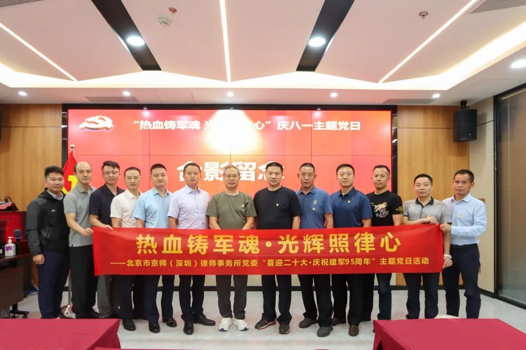 2022 年 8 月1 日,是中國人民解放軍建軍 95 周年,為弘揚(yáng)紀(jì)律嚴(yán)明、永不退縮、沖鋒在前、不怕困難的戰(zhàn)斗精神,創(chuàng)建一支為律師行業(yè)發(fā)展,為法治社會(huì)建設(shè)凝心聚力、保駕護(hù)航的人民律師隊(duì)伍,京師深圳律所黨委開展了“熱血鑄軍魂·光輝照律心”慶八一主題黨日活動(dòng)。 京師深圳律所黨委書記林冰同志;黨委副書記、紀(jì)委書記江澤利同志;黨委青工委委員、團(tuán)支部書記吳小潘同志;軍轉(zhuǎn)律師法律服務(wù)中心主任、為軍法律服務(wù)團(tuán)團(tuán)長孟長江同志以及律所軍轉(zhuǎn)律師、各黨支部黨員齊聚一堂,共同慶祝這意義非凡的節(jié)日。 活動(dòng)上,全體參會(huì)人員齊唱國歌、軍歌《強(qiáng)軍戰(zhàn)歌》,回憶軍旅生涯,喚醒紅色底蘊(yùn),激發(fā)戰(zhàn)斗意志,不忘初心與使命。雖脫下了軍裝,但軍心仍然熾烈。