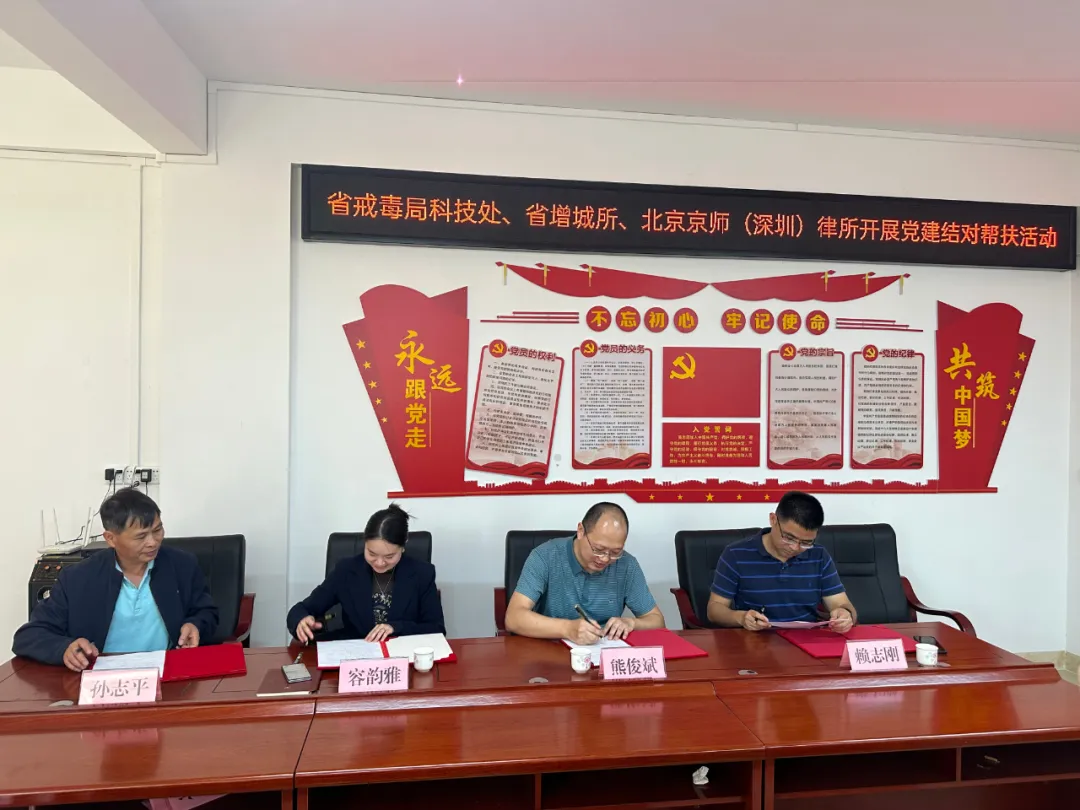 活動首先在黃坑村黨群服務(wù)中心召開黨建結(jié)對幫扶簽約座談會。會上,省局科技處處長熊俊斌、省增城所副所長賴志剛、黃坑村書記孫志平以及京師深圳律所黨委宣傳委員容韻雅律師分別介紹幫扶工作隊近年在徑南鎮(zhèn)開展幫扶工作的情況和京師深圳律所黨委的黨建基本情況。圍繞鄉(xiāng)村振興示范帶建設(shè)、人居環(huán)境整治提升、鄉(xiāng)村特色產(chǎn)業(yè)發(fā)展布局、鄉(xiāng)村平安法治建設(shè)等方面工作,雙方?jīng)Q定深入結(jié)對幫扶村莊開展調(diào)研,并就接下來的工作方向達成了共識。